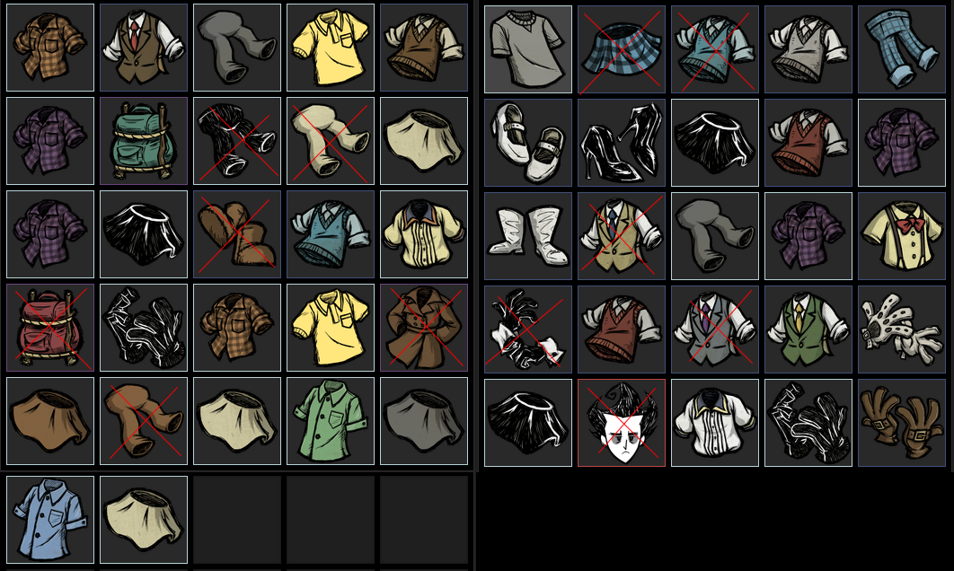 Exhu Posted February 11, 2016 Share Posted February 11, 2016 11 hours ago, thegreatmanagement said: 10 minutes ago, TemporaryMan said: Reveal hidden contents Common Red Sneakers *** Green Sneakers * Blue Collared Shirt * Classy Red Cardigan * Teal Cardigan * White Cardigan *** Spiffy Green Backpack X Pink Silk Robe *** Yellow Silk Robe * Red Silk Robe *** Distinguished Mess Dress *** Cocktail Dress *** Formal Jacket * Valkyrie Armor ***** Tuxedo *** Party Frock * Canadian Jacket *** Black Silk Loungewear ***** Green Silk Loungewear * White Silk Loungewear * Red Silk Loungewear *** Elegant Beefalo Carryall *** Scorching Satchel * Smallbird Satchel *** Spider Sack * Back Bat * Poop Bag X Wigfrid GoH ***** Wilson GoH * Wicker GoH ***** Willow GoH * Wendy GoH *** Wolfgang GoH *** Webber GoH * Woodie GoH * Wes GoH * How about star ratings, then? The despair when you're too colorblind to distinguish what the coding is lol Thanks Haha you did the work for me XD I'll add this in Link to comment https://forums.kleientertainment.com/forums/topic/58474-clothing-trading-depot-get-rid-of-those-double-drops-for-new-swag/page/31/#findComment-721117 Share on other sites More sharing options...