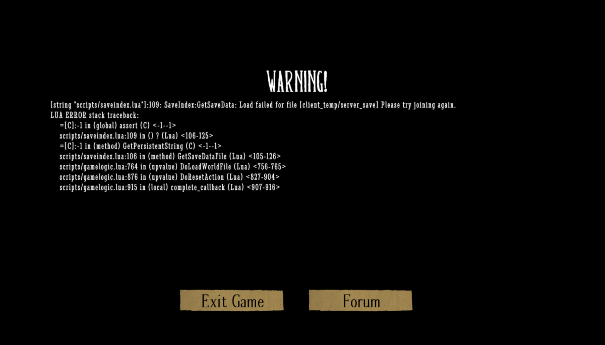 tuturd38 Posted November 16, 2015 Author Share Posted November 16, 2015 How did you fix it? bizziboiMember291 postsPosted 01 April 2015 - 08:30 AM As for you issue, you could try launching the game as administrator. If that fails, try creating another save directory (say c:\DontStarveTogether) and then launch the game with that as the save directory: - In steam right-click the game in your library- Select 'properties'- Click 'Set launch options'- Enter '-persistent_storage_root c:\Don'tStarveTogether' (without the quotes)- Close dialog.- And the next one- Launch the game. It's work for me Link to comment https://forums.kleientertainment.com/forums/topic/59052-script-error/#findComment-686442 Share on other sites More sharing options...