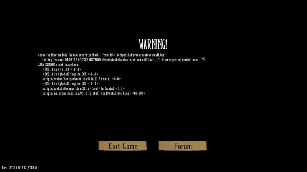 OrangeStarver Posted November 20, 2015 Share Posted November 20, 2015 LOOK AT THE ATTACHMENT!!!!WHAT DOES IT MEAN?WHAT SHOULD I DO?!Do you happen to have any mods installed? Specifiacly the "No Forced Wall Attack" mod? If so, try removing them, do this by turning them off in game > unsubscribing them on steam > removing it's files from ,/Steam/SteamApps/common/Don't Starve Together Beta (Don't Starve Together if you're using cavesbeta)/mods/ and folder with this mod. If you have multiple mods there will be multiple folders each named by mod's ID, you can check out mod's ID by looking at it's workshop page, for example "http://steamcommunity.com/sharedfiles/filedetails/?id=556027744"This mod's ID is 556027744. Link to comment https://forums.kleientertainment.com/forums/topic/59245-i-dont-know-anymore-why-does-the-game-hate-me/#findComment-687356 Share on other sites More sharing options...