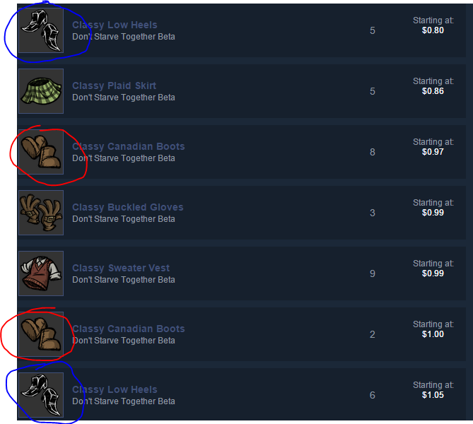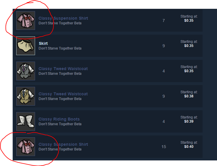 WriteOff Posted February 12, 2016 Author Share Posted February 12, 2016 Im sure this relates directly to the original issue, but unsure if it still needs attention - @nome if i search via steam community market for lets say "Formal Jacket", im getting one set of results, however if i select the same item from my inventory and click "View in market" its taking me to a different listing of same item, is a re-route required for market link on items, or is market looking at wrong items. Something is up either way, confirm for yourselves, cheers! Link to comment https://forums.kleientertainment.com/forums/topic/64216-market-listings-grouping-incorrectly/#findComment-721363 Share on other sites More sharing options...