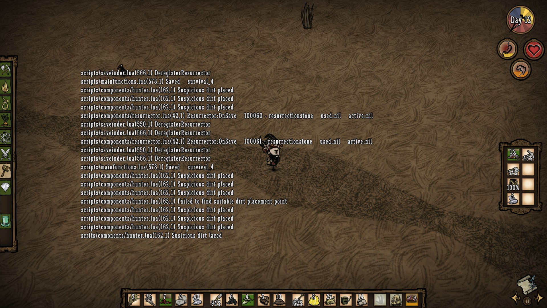 Zackman777 Posted March 12, 2016 Share Posted March 12, 2016 Warning: If you're a new player, turn back now and go explore and enjoy the game a lot before reading this! Koalefant Mechanic (experimenting) So I think I just figured out something about the mechanic involving Koalefants (might relate to the Blue/White Whale in Shipwrecked also) and how their tracks are placed. I made a previous thread a pretty long time ago asking about this and had some really great responses to it. If you would like to read that, check it out here: I'm hoping this could be a thread where people can share what they've noticed and what they think about the mechanics of Koalefant (or Whale) track placements. What I have figured out recently (RoG) On top of all the info, theories, and thoughts of the previous thread I've made about Koalefants, I've recently tried something with the log up in game (Control+L) to see if a certain theory would prove true. After several attempts to try it out, it definitely was correct 100% of the time. So here's what happened: I was at my camp farming and creating more farms - I got up to nine improved farms around day five or six- and noticed there was a track nearby. I just ignored it for about four or five days only to find that it never disappeared. Note that I was always around this area and never left for the four or five days I ignored it. This was because I was only collecting manure, seeds, and grass for creating more improved farms and growing crops, which we all know are items we can acquire in a plains biome with beefalo. After the four or five days of noticing this track staying in place, I ended up having to leave and go pretty far to get some logs and flowers in a different biome. After travelling this distance, I checked the log (again Control+L) to see that another track was placed. When I decided to get back to base and checked the log, I saw that another one was placed immediately. As a result, I decided to try something out. I would travel left and head quite a distance away with the log up until I saw the game place another track. When it did, I would stop and travel back to my base, which apparently caused the game to place another track right when I got there. I went back and forth several times between these two exact points to see if it would just keep relocating the tracks over and over again really quickly. Here's a screenshot of the results from doing this within the same day in only a short time: (The "Failed to find suitable dirt placement point" message occurred because I traveled a little too close to the edge of land at the second point once) This means that the way the game decides to relocate the tracks isn't based on any given interval of time. Instead, it's based on distance traveled away from a track by the player. I'm not entirely sure of the details of this. For example, if this range varies every time, or after finding and killing a Koalefant if there is a cooldown time before another track is placed. I'm going to definitely do some more testing in the original DS and DST, but I think I'm on to something here. Another thought I had was what if the distance was shortened in DST compared to DS, and that's the reason why these tracks appear to show up so much more often in DST (to have a higher chance of players finding them since there are more mouths to feed). The wiki article for the Koalefant and Blue/White Whale state somewhere along the lines of "These can be found randomly in the world (or in the deep ocean) and will change locations if ignored for a period of time". I think these statements could be changed if what I'm seeing here is correct, but what do you guys think? Anyways, I was wondering what everyone might think of this overall and if they've experienced anything that might relate to this. I will definitely be trying this out with the regular version of the game, DST, and possibly Shipwrecked if I purchase it. Whatever else I find, I'll post it here. If anyone else want to help out with this, I'd appreciate it. Link to comment https://forums.kleientertainment.com/forums/topic/65360-figured-out-koalefant-whale-mechanic-tracks/ Share on other sites More sharing options...