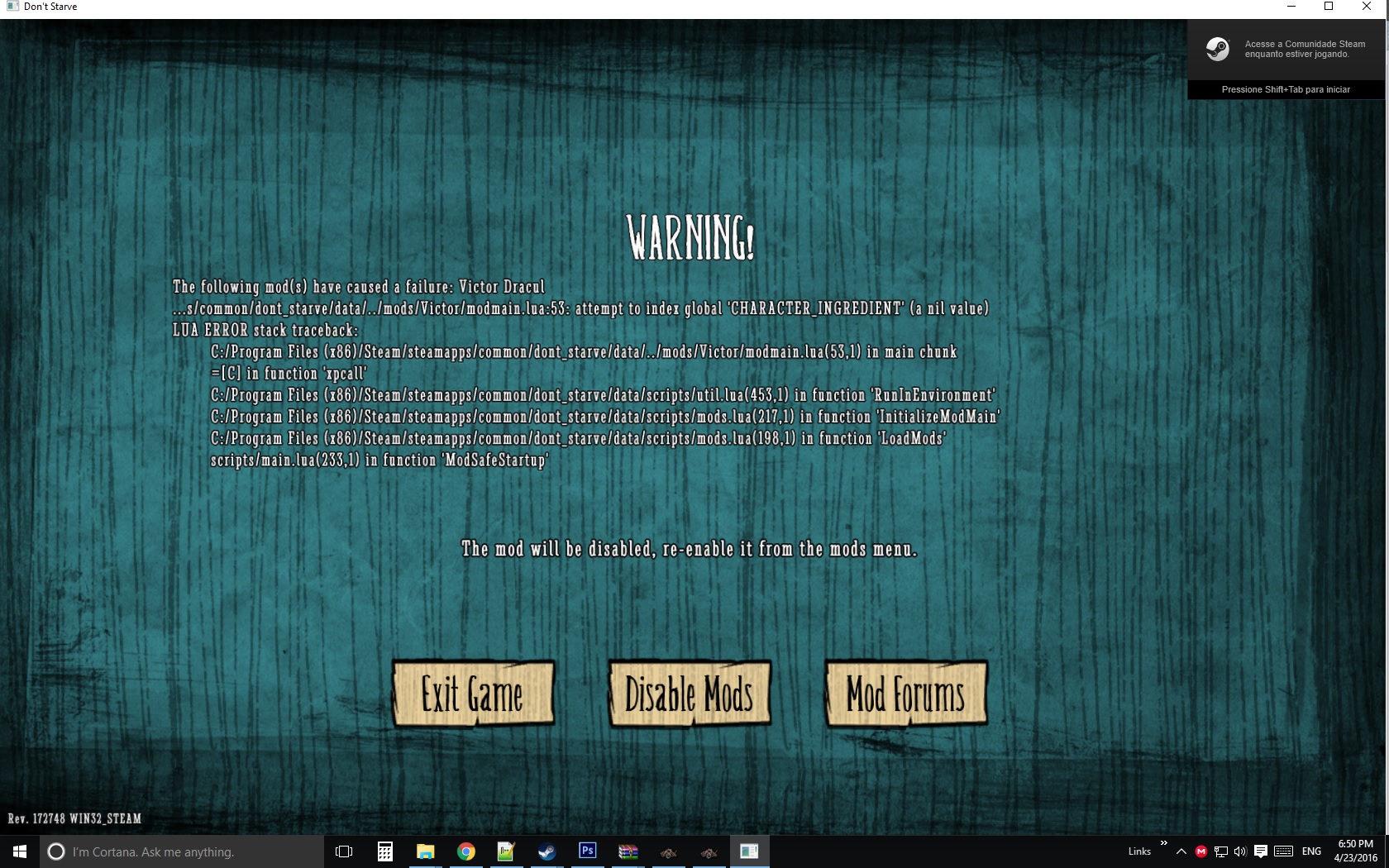 Vecto0r Posted April 23, 2016 Share Posted April 23, 2016 (edited) i was tryng to make a recipe for my custom character in "modmain.lua" that cost healt it looks like this: Recipe("synch", { Ingredient("twigs", 2), Ingredient("flint", 2), Ingredient(CHARACTER_INGREDIENT.HEALTH, 10)}, RECIPETABS.WAR, TECH.NONE, nil, nil, nil, nil, "images/inventoryimages/synch.xml", "synch.tex") but everytime i start the game it crashes someone can help me plz? Edited April 23, 2016 by Vecto0r Link to comment https://forums.kleientertainment.com/forums/topic/66601-help-with-modding-recipes-with-healt-sanity-cost/ Share on other sites More sharing options...