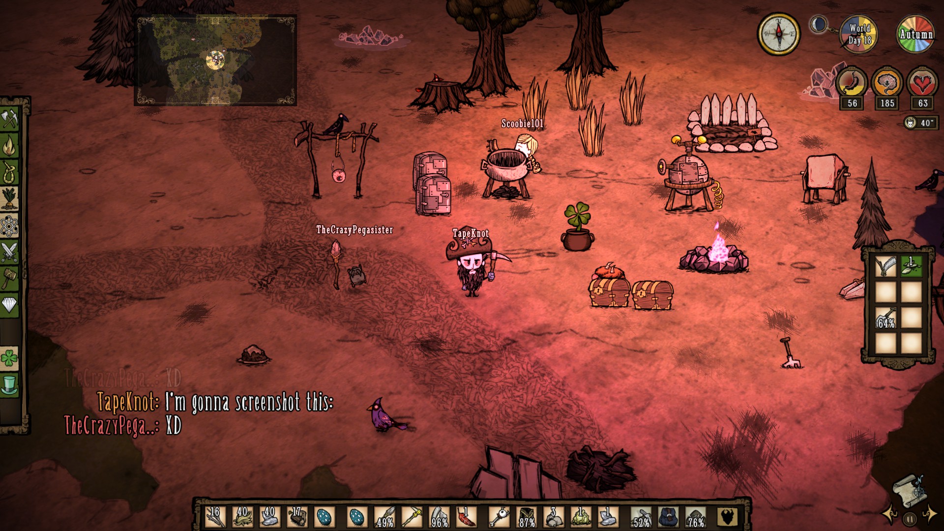 TapeKnot Posted June 20, 2016 Share Posted June 20, 2016 NOTE: This is not a bug or glitch of any kind. Me and my friend were playing on a modded server called Expanded Survival. So, I was playing on a server with my friend on day, (She was playing as Wickerbottom with a GoH skin, and me Wilson with some random skins) when she died. There was a touch stone near or base, so she revived using that. After coming back to our base, I saw that she had her GoH skin unequipped. This seemed to be strange as I never have seen it happen before, so I excused the thought as this being a cause of mods. She wanted to equip her GoH skin again, so she built a wardrobe. She equipped her GoH skin, and then became invisible after jumping out of the wardrobe. Nobody could see her character at all. So we had a small laugh, and she went off to troll some people with her newfound "power". And to prove this as true, I took a screenshot: Link to comment https://forums.kleientertainment.com/forums/topic/68351-the-invisible-librarian/ Share on other sites More sharing options...
