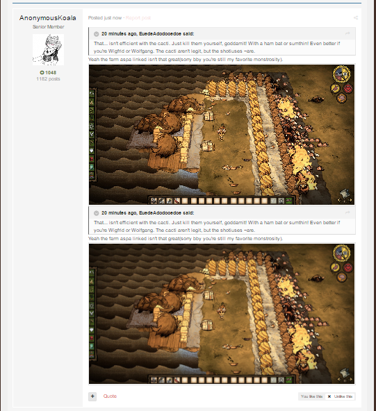 AnonymousKoala Posted July 13, 2016 Share Posted July 13, 2016 10 minutes ago, EuedeAdodooedoe said: That... isn't efficient with the cacti. Just kill them yourself, goddamit! With a ham bat or sumthin! Even better if you're Wigfrid or Wolfgang. The cacti aren't legit, but the shotiuses ~are. Yeah the farm aspa linked isn't that great(sorry bby you're still my favorite monstrosity). 10 minutes ago, EuedeAdodooedoe said: That... isn't efficient with the cacti. Just kill them yourself, goddamit! With a ham bat or sumthin! Even better if you're Wigfrid or Wolfgang. The cacti aren't legit, but the shotiuses ~are. Yeah the farm aspa linked isn't that great(sorry bby you're still my favorite monstrosity). Link to comment https://forums.kleientertainment.com/forums/topic/68831-is-it-worth-it-capturing-the-varg/#findComment-792222 Share on other sites More sharing options...