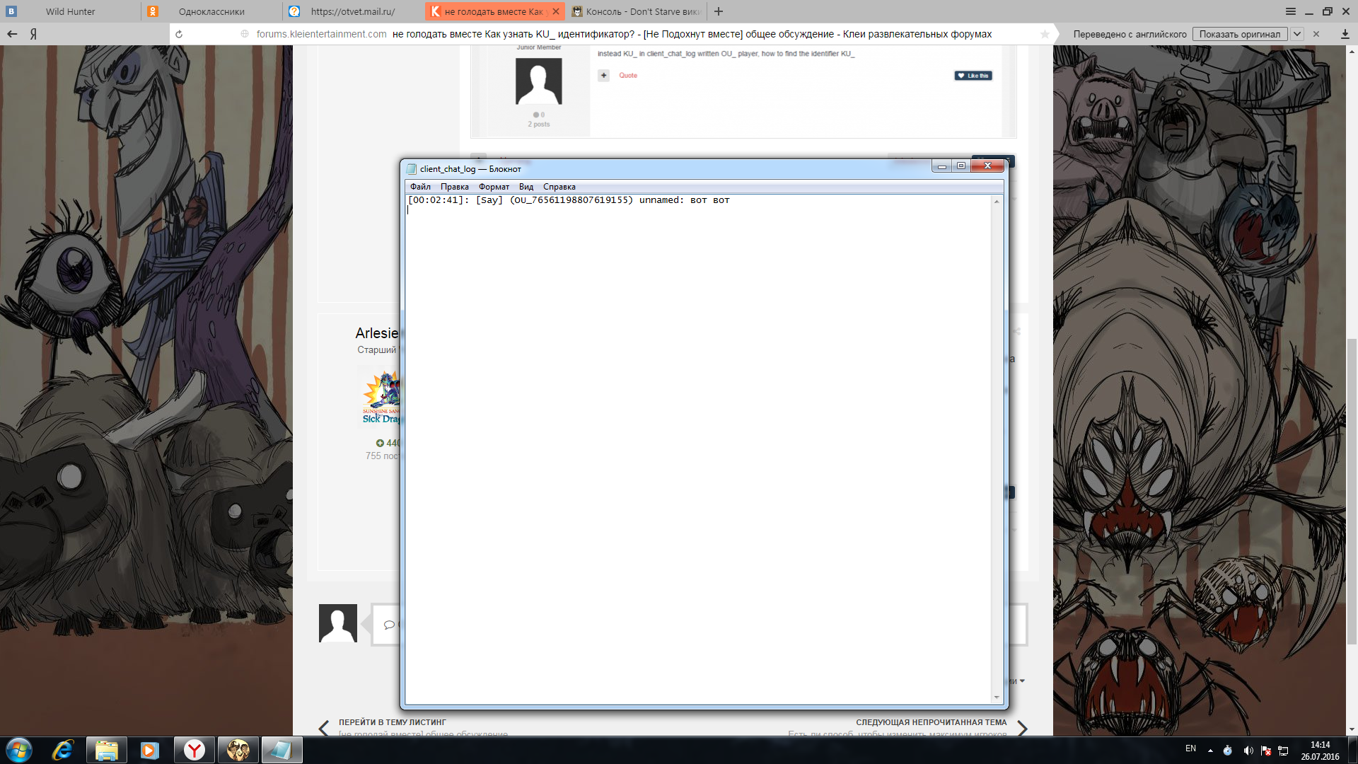 не знаю у меня не голодайте вместе 163935 версия скачана с кооп-Лэнд играю норм, друг зашел на сервер и прописал в чате пару слов и в chat_log видно вот так ([00:02:41]: [сказать] (OU_76561198807856155) babax: го играть