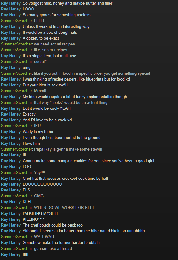 RyanandLink Posted September 6, 2016 Share Posted September 6, 2016 so me and my babe Ray were talking about Donuts and about what recipe they would have in Don't Starve then I was reminded of an older(ish) thread which had an [IMO] excellent idea: But that was put in the Don't Starve suggestions thread and it's already pretty old so I thought why not repeat the suggestion :> (contains a small amounts of naughty words so put in spoiler) Spoiler and now we're basically Klei devs i mean hehe xd Link to comment https://forums.kleientertainment.com/forums/topic/70014-klei-pls-donuts/ Share on other sites More sharing options...