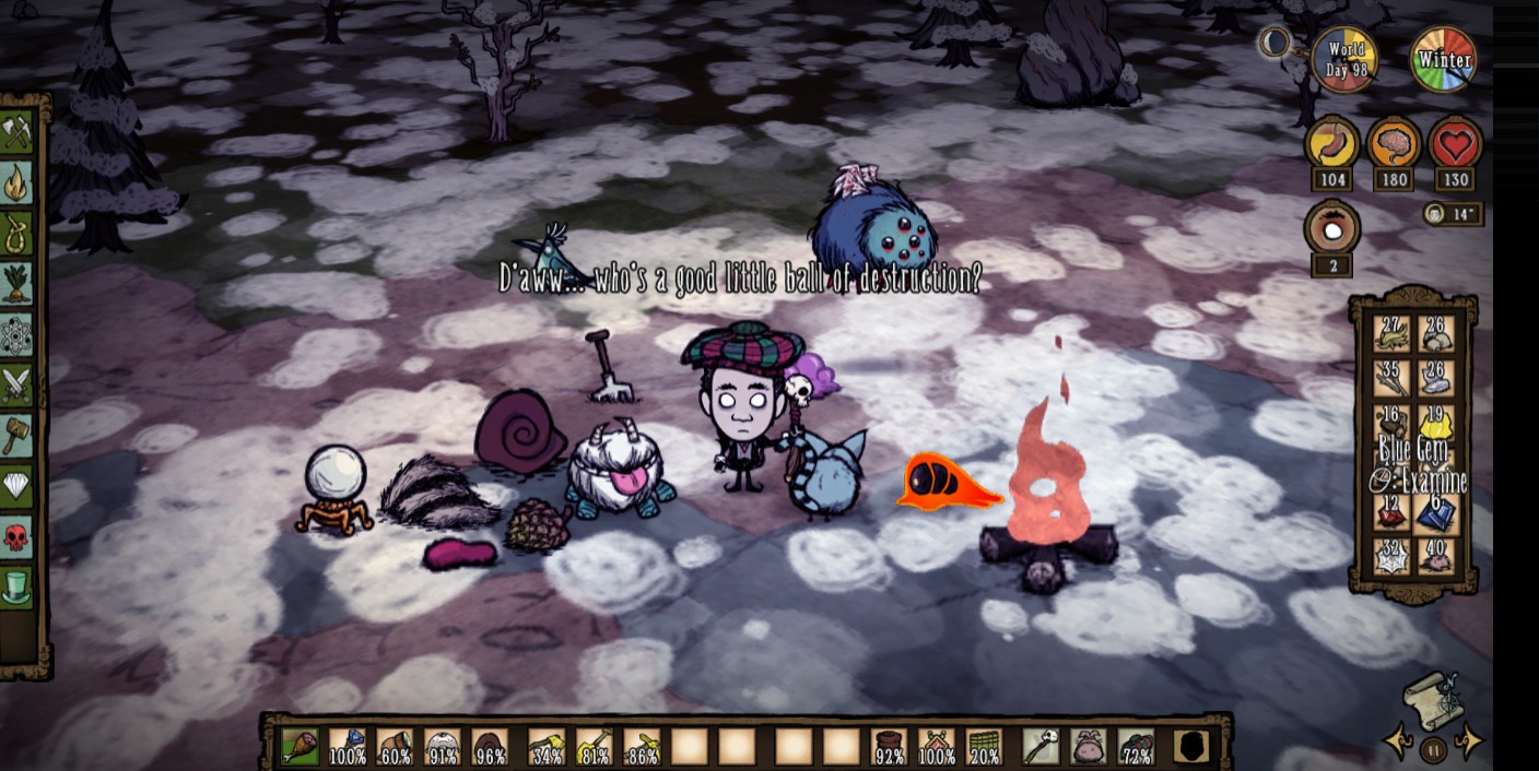 Asparagus Posted November 6, 2016 Share Posted November 6, 2016 I love these pets, love them! But you can only have one it seems... The Deed... Spoiler I love cats... so it was an obvious choice that I pick a kittycoon as a familiar... And what a grand time we had... his gentle "mew" was soothing... adorable, that I had to just sleep next to it at nights... During an surveying expedition to landscape an area, we had a slumber party! The egg is now hatching and soon, another friend will come! Alas, it was then that a dark whisper from the nether had wormed its way to my thoughts... Kill the incarnate of fire and bring it to meee... The deed was done... I had felt dirty... I had killed this new vibrant life... as my companions slept soundly, I wept... but there was no going back... I left my companions behind so they may not see my shame... but Mr. Snuggles was adamant to keep me company... my heart was lightened... even for a moment... It was time... I have come to do the deed... But fate was cruel... and so was She... she's mocking me now... I had to decide... After all that, I had to follow through... it was for the best... I didn't want Mr. Snuggles to be with someone who would kill a friend... and so, I gave him up... In exchange, I had received a magical dragon... terrible and beautiful is it... all shall tremble! It was surging with energy... but when I touched it, I was reminded of the times that I was with Mr. Snuggles... and I wept... what had I done... Was it worth it though? Will it turn into my own personal Dragonfly? (probably not) TL;DR You can only have 1 pet. Your pet needs to be fed and be constantly loved. Pets stay away from danger as when you initiate combat against anything like mobs or walls. They can't seem to die anyway as during a hound attack, I hid under a Snurtle Shell Armor leaving the cat alone, asleep, as hounds were sniffing around... (eventually killed by bees when they attacked a wasp hive... You can abandon pets for new ones at the critter lab... To get a Chilled Lavae, you need to freeze an Extra-adorable Lavae (which drops from the Dragonfly)... and kill it... Feel bad about killing a portable camp fire and lose 2 pets at once for a Dragonfly pet... (your existing pet slot + lavae... which you can get another of by killing the Dragonfly again) Link to comment https://forums.kleientertainment.com/forums/topic/71456-critters-a-tale-of-two-pets-a-roller-coaster-of-emotions/ Share on other sites More sharing options...