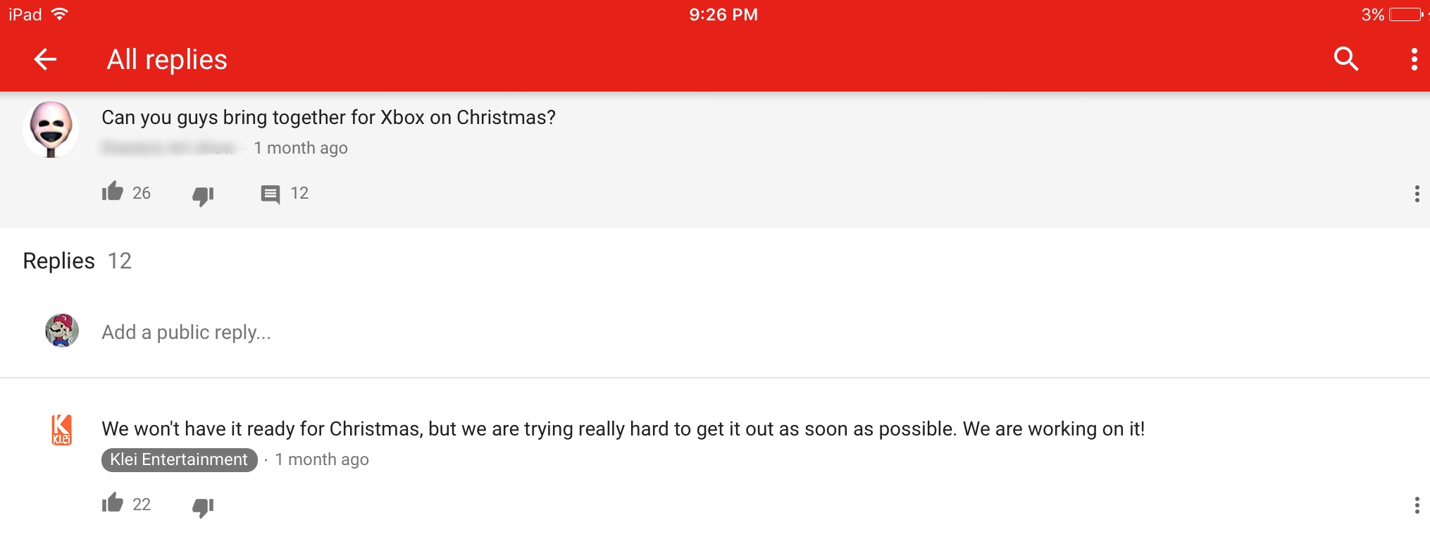 Dabb Posted January 24, 2017 Share Posted January 24, 2017 Hi I love don't starve I own DST on my computer but I also have an Xbox One and want to play it on there too. So I wanted to ask you guys if it would be possible to add it there too, thanks for your time! :3 Link to comment https://forums.kleientertainment.com/forums/topic/73570-dont-starve-together-xbox-one-edition/ Share on other sites More sharing options...