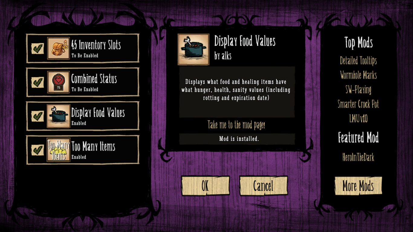 nopaiznada Posted March 11, 2017 Share Posted March 11, 2017 In total, I've downloaded Combined Status mod, 45 Slots mod, 99 Stacks mod, Minimap HUD mod, DisplayFoodValues mod and Too Many Items mod.... Only the last two of them worked and they were the only ones that the game popped the message to me that there were mods installed.... the other mods just have a message " To be enabled " and " Crashed ! " and " To be disabled ".... they just don't work... please I BEG YOU help. note : looking for some answers I found a topic saying that you have to change the " API " version and I did from 6 to 5, and 4 to 5 and keep trying to change it, but either way the other mods don't work. Thx. Link to comment https://forums.kleientertainment.com/forums/topic/75756-90-of-mods-i-download-becomes-crashed/ Share on other sites More sharing options...