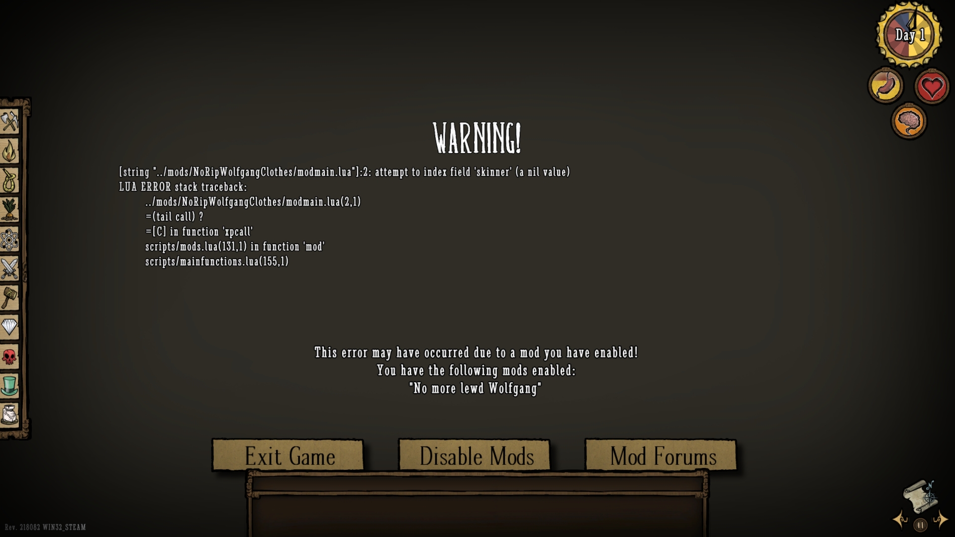t1morino88eex Posted June 1, 2017 Author Share Posted June 1, 2017 Thank you so much for the answer Rezecib! I put the function you created into the modmain.lua and made that into a mod but it crashes after selecting Wolfgang as a character. If selecting any other character the world starts ok and there's no crash. I am attaching the mod, log files and error screen. NoRipWolfgangClothes.zip client_log.txt Link to comment https://forums.kleientertainment.com/forums/topic/79399-no-more-clothes-ripping-for-wolfgang-when-in-mighty-form/#findComment-927359 Share on other sites More sharing options...