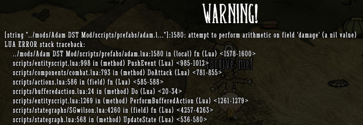 . . . Posted June 2, 2017 Author Share Posted June 2, 2017 (edited) I have no idea what to do, but here it is. Spoiler and the code that starts the crash Spoiler inst:ListenForEvent("onattackother", function(inst, data) local crit = math.random(1,1) local damage = data.target.damage * (1-data.target.components.health.absorb) -- Crash starts from this line. if crit == 1 then ShakeAllCameras(CAMERASHAKE.VERTICAL,.5, .05, .5, inst, .01) if data.target.components.health and not data.target.components.health:IsDead() then --data.target.components.combat:GetAttacked(inst, damage*2, nil) data.target.components.health:DoDelta(-damage * 2) end end end) & thanks for replying ! Edited June 2, 2017 by SuperDavid Link to comment https://forums.kleientertainment.com/forums/topic/79463-solved-how-to-multiply-damage-the-target-takes/#findComment-928062 Share on other sites More sharing options...