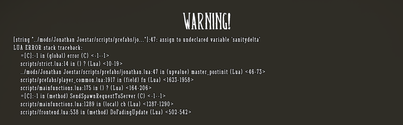 moonsidian Posted July 24, 2017 Author Share Posted July 24, 2017 9 hours ago, ZupaleX said: Hi, does this even compile and run? it seems to compile, and when i run the game i can select my character. however, once i press the "go" button on the screen where you can customize the character, this error message pops up: Link to comment https://forums.kleientertainment.com/forums/topic/80806-solved-unable-to-get-my-mod-to-work/#findComment-941365 Share on other sites More sharing options...