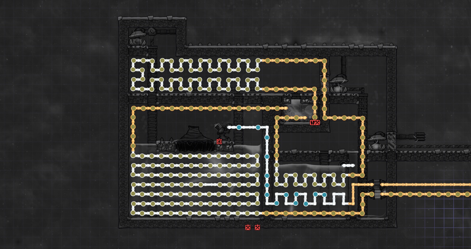 Sevio Posted September 3, 2017 Share Posted September 3, 2017 @Saturnus That feedback loop is a useful technique to help save power on pumping, thanks for that! Since we're sharing Aquatuner boiler builds here, I thought I'd share my standalone boiler which came out of my experiments in heat transfer between fluids and happens to be posted in that thread: In my survival games I rarely seem to get to the point where I can just hollow out half the asteroid and have lots of space available, so my main goal for this one was compactness while still maximizing throughput for a single aquatuner. As a result it does use a bunch of wire bridges and doors but that allowed me to keep the size down to 16 tiles wide by 18 tiles tall. It can process 2250 g/s polluted water in cold mode and up to about 3250 g/s in power mode. Edit: Updated design which can do 5000 g/s standalone! Link to comment https://forums.kleientertainment.com/forums/topic/81655-oni-steam-geyser-aquatuner-coolerdirty-water-distiller-tungsten-crafting/page/2/#findComment-950122 Share on other sites More sharing options...