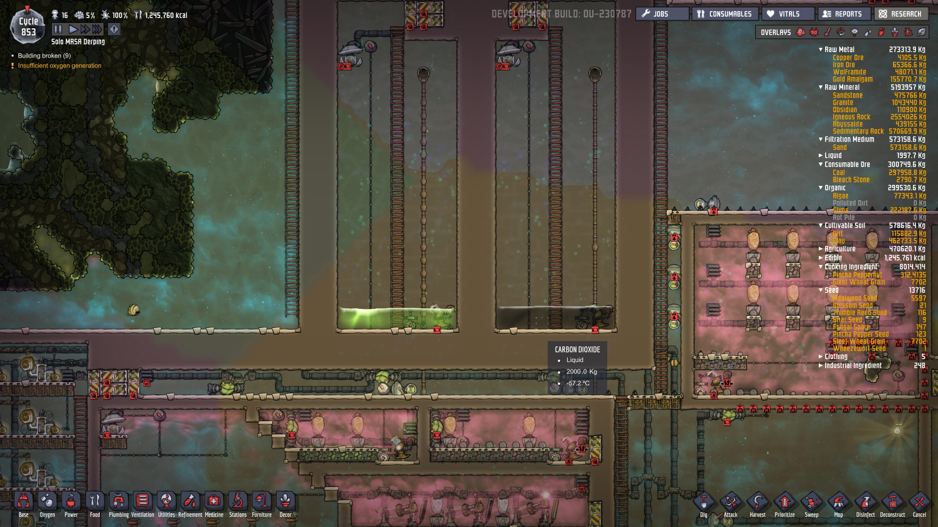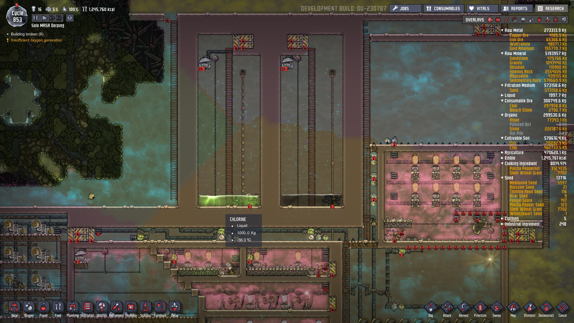 Lifegrow Posted September 11, 2017 Share Posted September 11, 2017 1 hour ago, BlueLance said: Before the outbreak update you could just mop it up and it would be gone XD Yeah 800kg per tile in liquid form is fine, plus even if it starts to turn into gas, you could keep it stored in the room anyway right? or would it break the walls if 800kg of chlorine turned to gas? I have 2 rooms for this sort of thing - one room to liquify/solidify - and another room to store the liquid itself. That way you can turn the liquid room into a vacuum and once your pumps/switches and whatever else you might have in the room reach the -temps needed to keep the substance in a liquid state, it'll never turn back into gas. Also Chlorine is 1000kg per tile, CO2 is 2000kg per tile. See pics. should probably explain - ignore the hydrogen filled tank on the right side - that was to see whether I could solidify the CO2 emitted by 10 NGG's (turns out I could, but where's the fun in that!) Link to comment https://forums.kleientertainment.com/forums/topic/81909-liquid-chlorine-storage/#findComment-952416 Share on other sites More sharing options...
