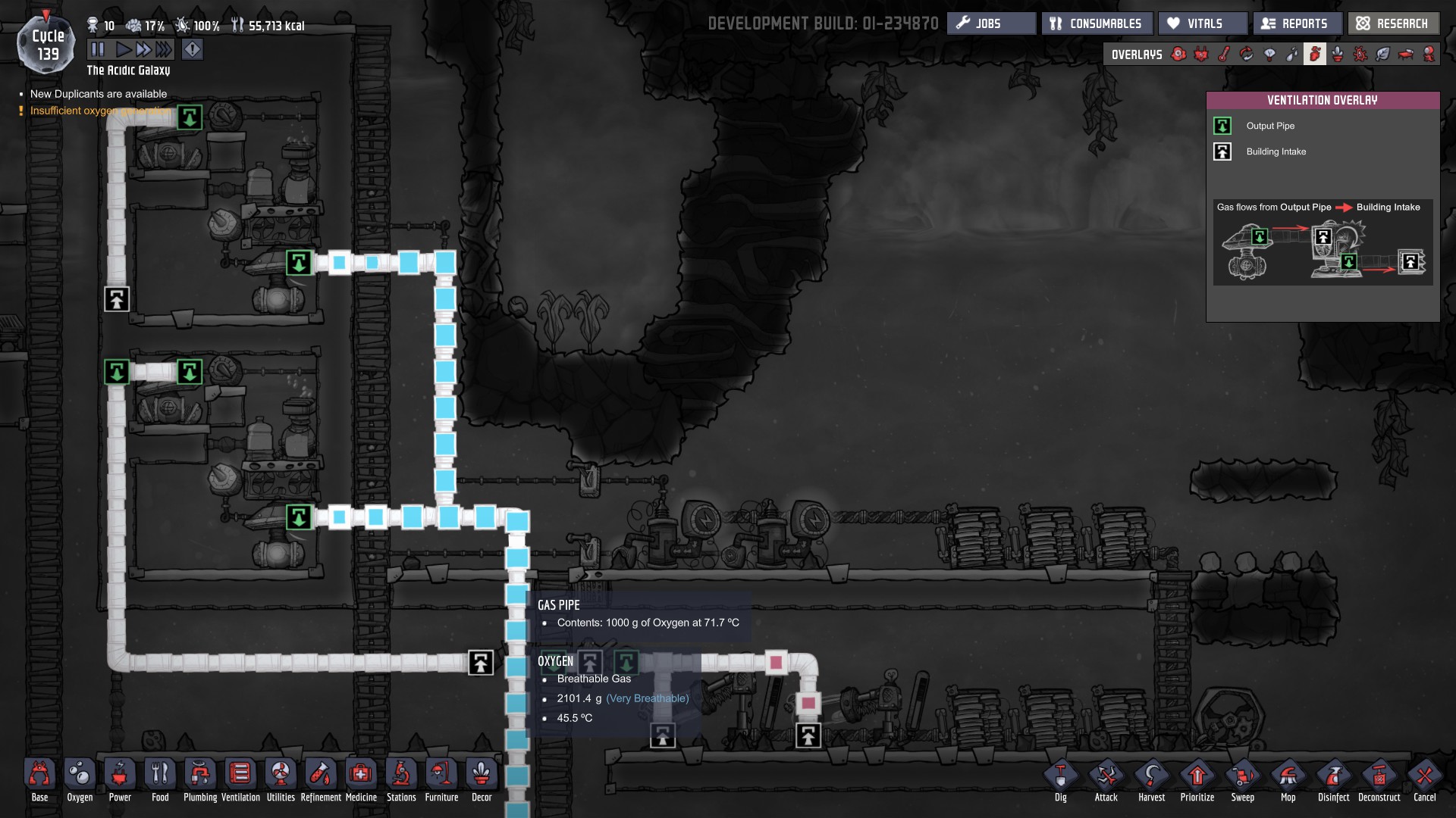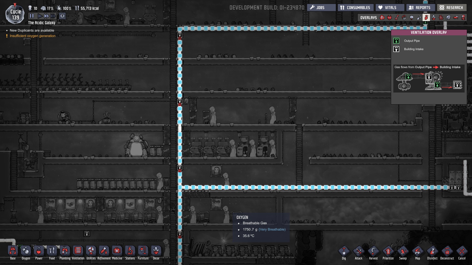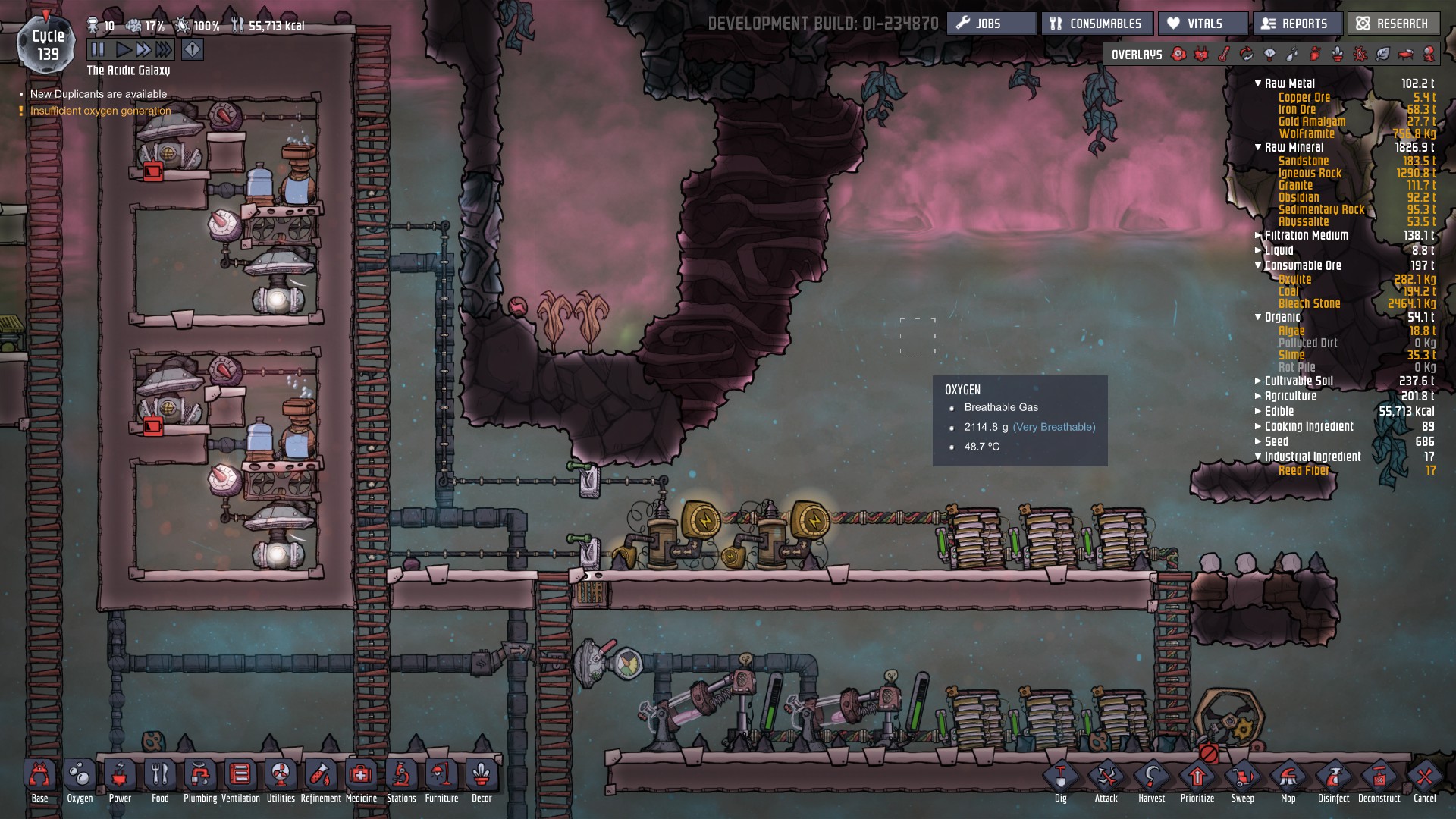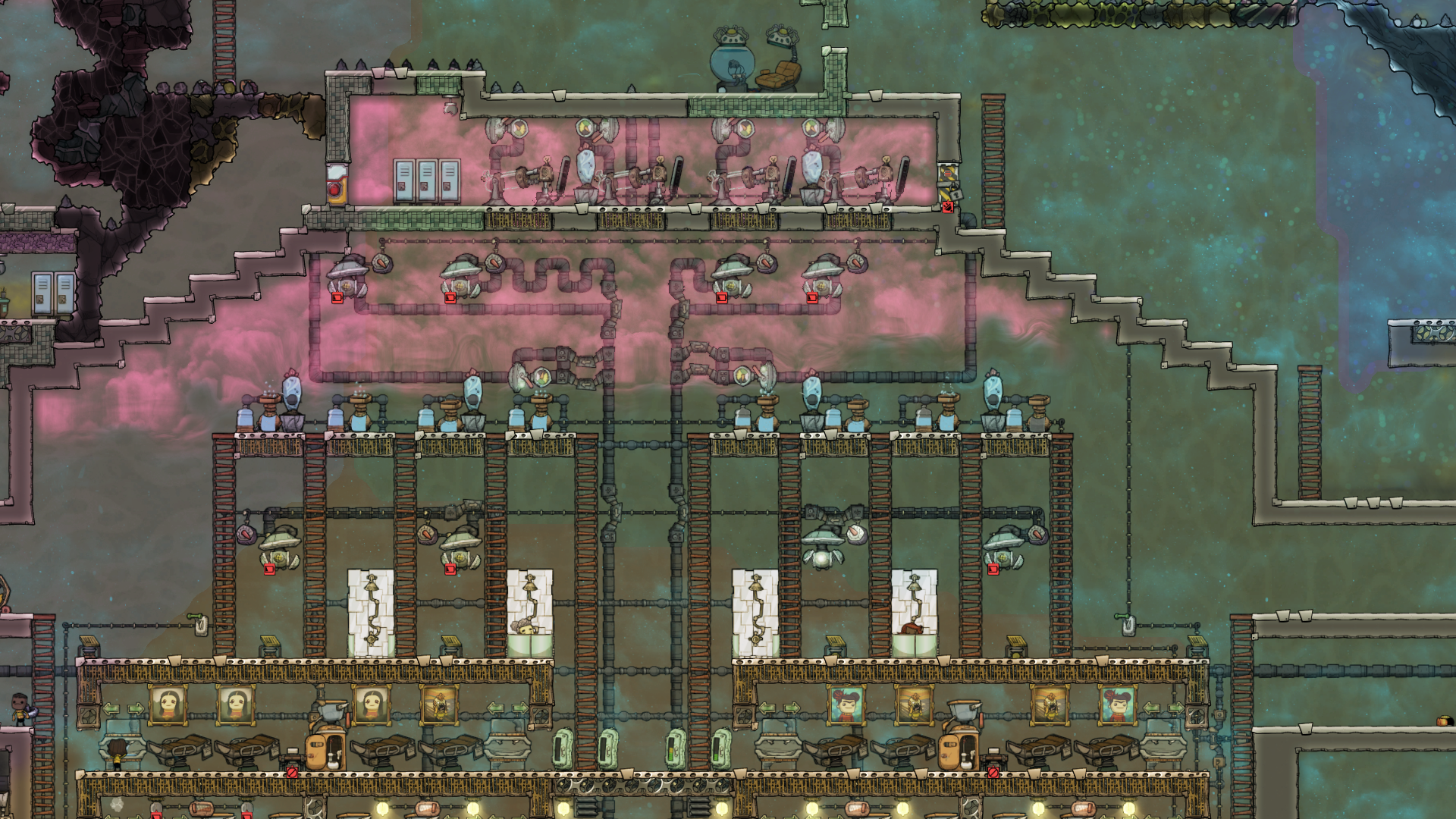 Lifegrow Posted September 29, 2017 Share Posted September 29, 2017 Hot oxygen is never a problem I worry about - just build more electrolyzers than you need, and allow them to run intermittently to self-cool. Throw a few wheezeworts into the mix, and then regulate your base temperature with lamps. Easy as that. Not that it matters a jot, but they're fed straight from a geyser and my base runs at 16-20 degrees. I've now started oxygenating the asteroid with surplus oxygen to kill off all the slimelung in the rock (hence the outside of the base on the right side being somewhat oxygenated. Example from my current experimental base : This idea of efficiency is somewhat lost on me though as I build big, if I miss a few grams of hydrogen it really doesn't matter - i'm more concerned about sufficient oxygen. If I want hydrogen, I either skim it off my generator line, or build a remote electrolyzer nearer the task. Link to comment https://forums.kleientertainment.com/forums/topic/82467-inefffective-electrolyzer/#findComment-959036 Share on other sites More sharing options...