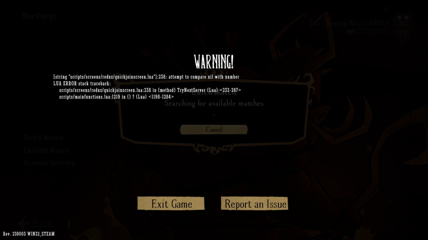 Hey @Pyrolantern, we have a dedicated Klei Bug Tracker for The Forge. Found here: Don't Starve Together: The Forge Beta. If possible, get your client_log.txt file from C:\Users\User\Documents\Klei\DoNotStarveTogether and attach it to your report there. If the client_log.txt no longer ends the same way the image above does, just make sure to attach this very same photo in your bug report. Since we can not move subforum posts into bug trackers directly.