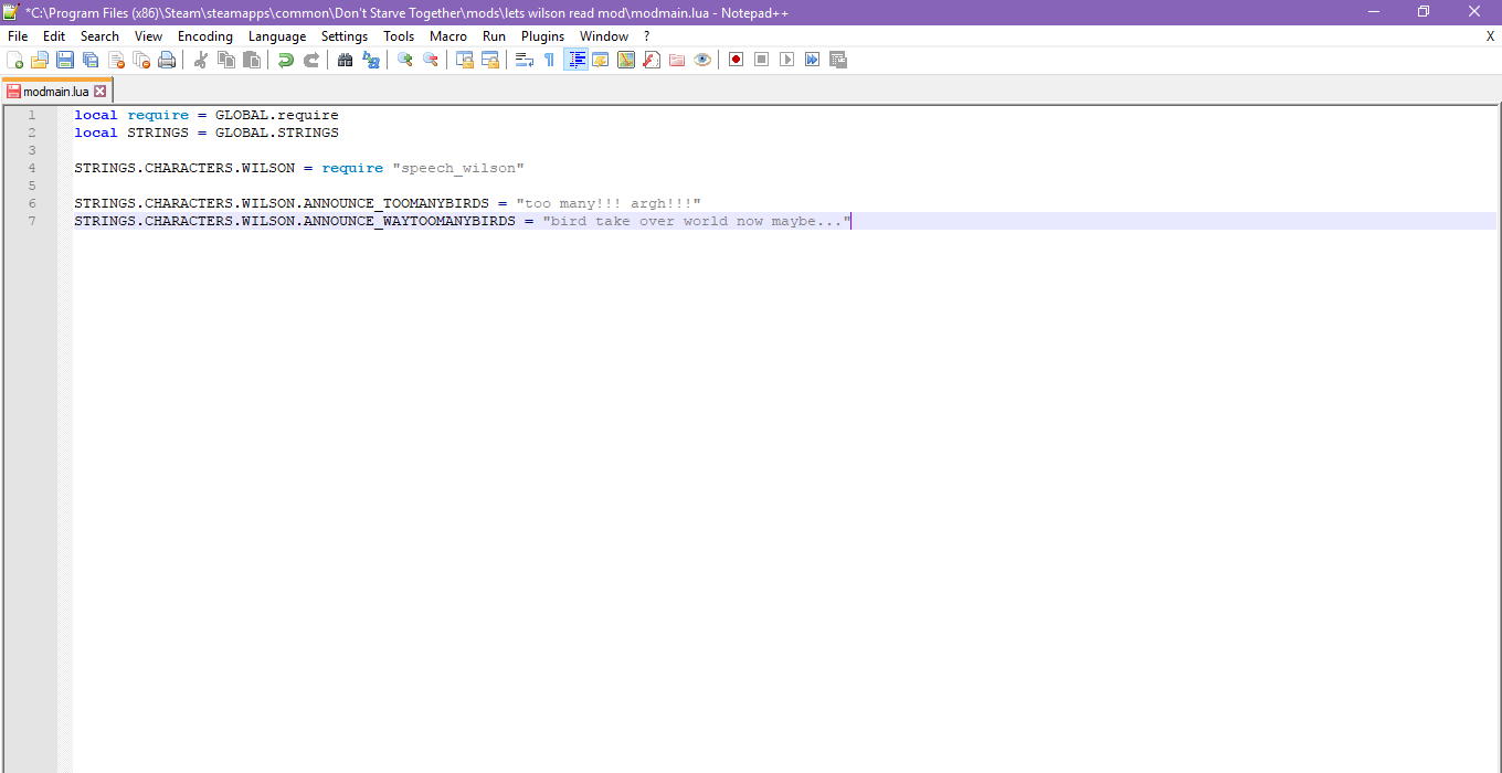 Ressayez Posted December 13, 2017 Author Share Posted December 13, 2017 40 minutes ago, verdago7 said: I'm not 100%, but try adding this to your prefab STRINGS.CHARACTERS.ANNOUNCE_TOOMANYBIRDS = ...... It'll be something along those lines, you could always dig through some custom speech from other mods to find specifically announce strings. I've used describe before with a similar string and it worked. I can't thank you enough??? Link to comment https://forums.kleientertainment.com/forums/topic/85012-too-many-birds-announcement-strings/#findComment-983682 Share on other sites More sharing options...