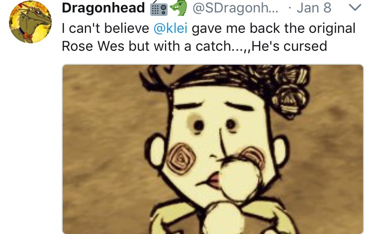 SDragonhead Posted January 5, 2018 Author Share Posted January 5, 2018 7 hours ago, Wilson_pl said: I prefer the GoH expression,for some reason. He even has it on the portrait. Hmm well in the first ever images of the rose skin came out months ago it was still the original design. And even despite the update with the eyes he still has the original eyes in his side view. Still original sprite despite the update Heres a PSA Link to comment https://forums.kleientertainment.com/forums/topic/86085-wes-updated-roseate-skin-sprite-change-it-back/#findComment-989999 Share on other sites More sharing options...
