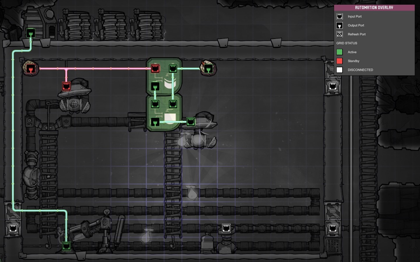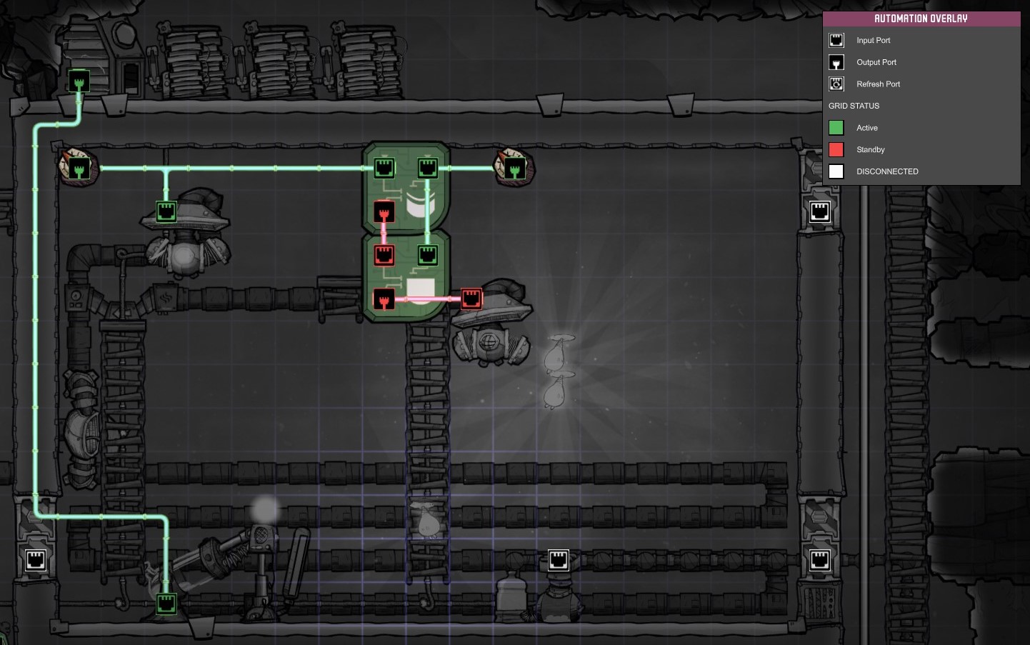 The Plum Gate Posted January 31, 2018 Share Posted January 31, 2018 The occupational update brings some new automation opportunities to us with the new machines, so do share.. I thought I would share a generic but useful mid to early game automation circuit - I needed it mostly when trying to manage power line load with various machines running - I needed them to run, but not all at the same time - so huzzah for automation. This is basically a priority automation circuit where one signal can interrupt another without back-bridging the interrupting circuit or creating a race condition with competing on off signals. For this case, I have two pumps gas and I don't want them to both run at the same time ( because of the power limits in my early base ). Both pumps - I only want on under certain atmospheric conditions - I'm using two atmo-switches accordingly. The pump ( and atmo switch ) on the left is my interrupter - when it's on, regardless of what the other atmo switch ( right side signal ) is indicating, that right side automation circuit ( and pump ) needs to be off. In other words, the pump on the right needs to run when the atmo switch on the right tells it to, unless it's interrupted. I was able to accomplish this by using two gates, XOR and AND. So each pump will turn on and off according to their atmo switches - unless both turn on. The left side automation circuit has priority over the other. A permissive NOT signal injection into the line when it turns on. The above state allows the right hand side to operate by bridging the conditional input of the XOR with the input of the AND. The AND receives the XOR signal as on and the Atmo signal as on and the pump turns on. Right hand circuit is not interrupted. The above state turns on the pump at the right directly, and throws an on signal to the XOR gate. If the on states happen to be the same - either both on or both off, the XOR gates throws an off signal - the right hand circuit is interrupted ( in this case it's the upper right green through the gates to the output of the AND gate ). In the event that the left side is on and right circuit is off, then the bridge from XOR input to AND input would cause the And output to be false. Not shown is when both are off, XOR is also off and AND is also off since both inputs to AND must be true to turn on. Accordingly, The right side atmo switch would be off (false) and thus the right side of the circuit and pump. I can see how this might be a nice circuit to have in the future. I'm sure there are significantly more efficient ways to set up an elctrolyizer room, but this is about the circuit I'm posting here. One could argue that a power cutoff switch might be used in this instance, but that turned out to be more of a hassle than I thought. Here are some other useful links in the forum: Enjoy that last one! Link to comment https://forums.kleientertainment.com/forums/topic/86981-new-update-new-automation-opportunites/ Share on other sites More sharing options...