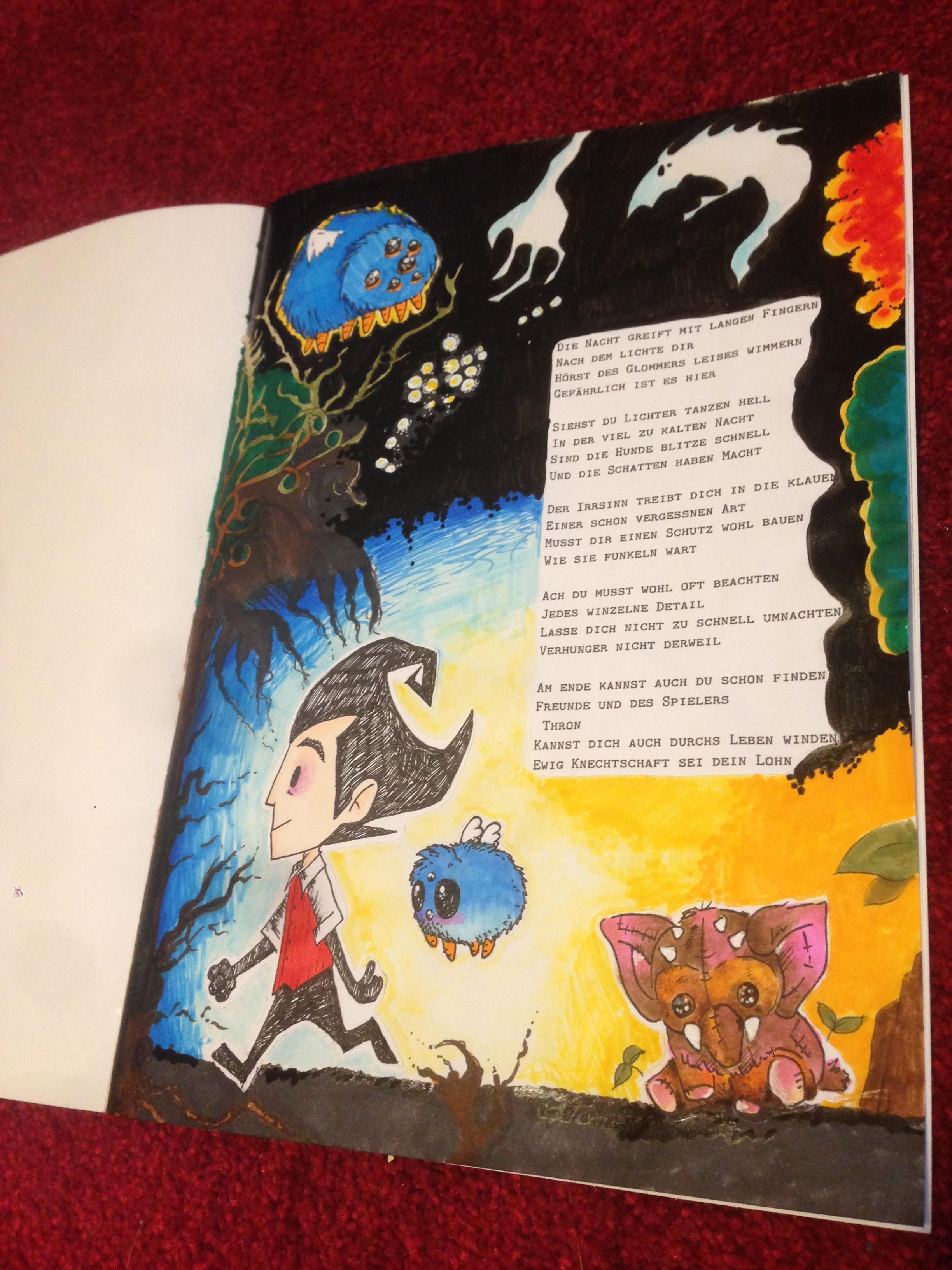 Jellyfishcouple Posted February 16, 2018 Author Share Posted February 16, 2018 1 hour ago, Zhuzha said: This is just precious! Also I've translated the poem (albeit, with no rhyme), I hope you don't mind. Apologies for any mistakes, my German is about as rusty as Survivor WX. Reveal hidden contents The night grabs your light/ With her long fingers/ You hear Glommer's quiet whimpering/ It's dangerous in here You see the lights dancing brightly/ In such a cold night/ The hounds are fast as lightning/ And the shadows have power Insanity drives you into the claws/ Of a long forgotten species/ You must build the shelter well/ As they glisten (?) Oh, you must pay close attention/ To every detail/ Don't lose your mind too fast/ And don't starve in the meantime At the end you can find/ Friends and the player's throne/ You can also writhe through life (?)/ Eternal imprisonment shall be your reward Oh thats fantastic you are amazing! What do you think about it ? Have a wonderful day ! 1 Link to comment https://forums.kleientertainment.com/forums/topic/87390-my-don%C2%B4t-starve-storybook/#findComment-1004966 Share on other sites More sharing options...