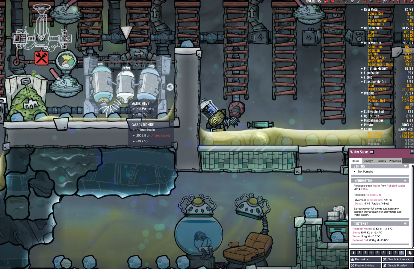 Coolthulhu Posted April 17, 2018 Share Posted April 17, 2018 Just now, MythN7 said: So then you could put the sieve right beside a nullifier and use a valve so that it only lets say 100g threw, making the bulk of the fluid locked in the pipe, so that you dont need other cooling methods? I know this would be very limited in terms of useful volume, just seeing if I get the mechanic right. You must drain the clean water from the sieve faster than it is produced. If you put a valve on polluted water, you slow down production, which makes draining it easier. But valve on the clean water will only make it stay in the sieve longer, meaning more temperature exchange. Also, on the pic, all the water is fed into electrolyzer, which ignores input temperature. It's best to feed it water near boiling temperature. Link to comment https://forums.kleientertainment.com/forums/topic/89897-why-do-i-have-1-abys-pipe-seg-that-keeps-taking-cold-damage/#findComment-1027079 Share on other sites More sharing options...