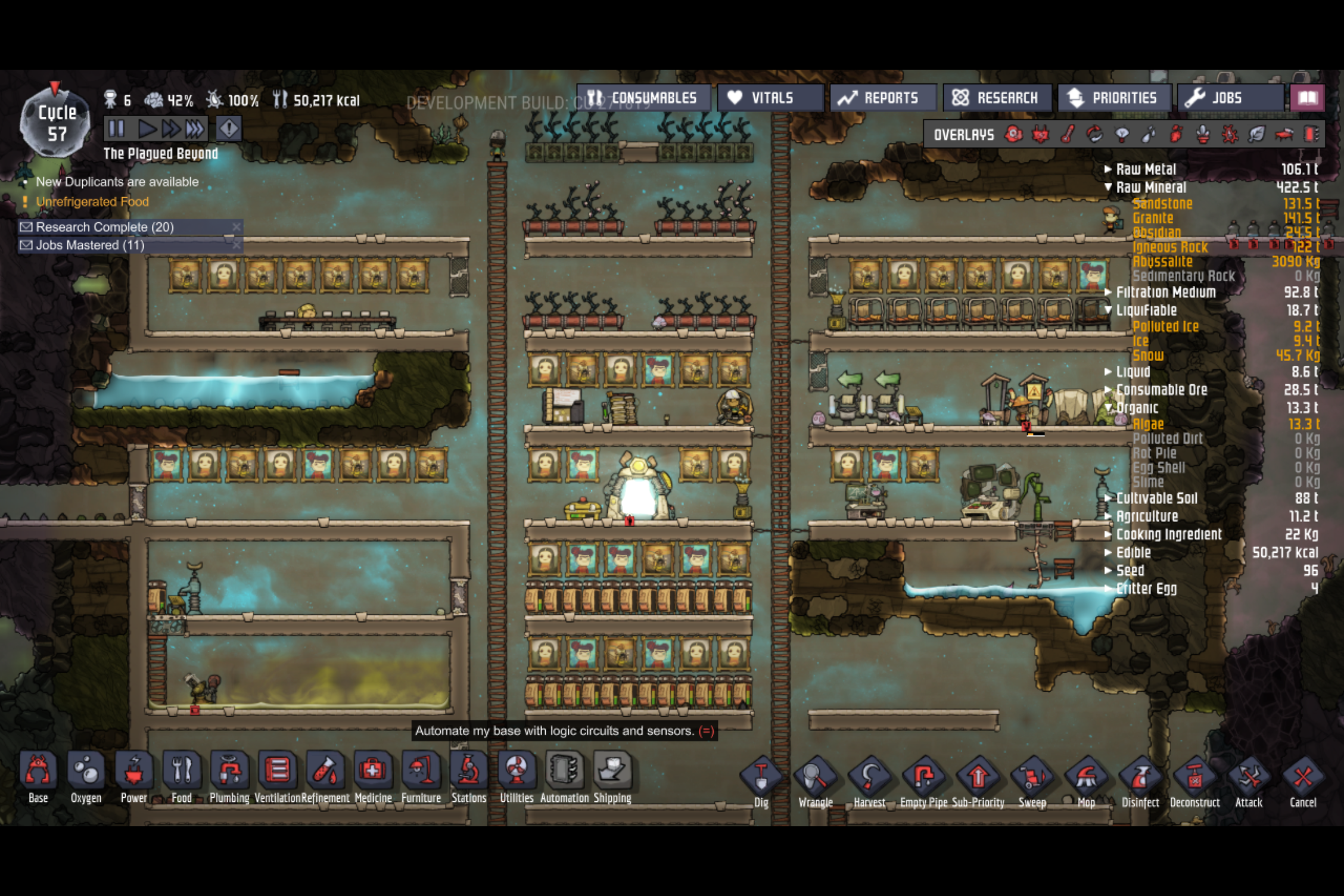 I need advise. I am not sure whats the right path I need to take  in my base. Its just 55 cycle old base, I am getting my oxygen using algae, I got 17 tons of algae so I am not worried yet on switching to Electrolyser yet. I quite stuck I am not sure what should I be investing next, my food source is mealwood because I do not want to spend so much water. Near my base I got water gayser, Gold Volcano and cool steam vent so not sure where should be pointing my focus next? Should it be Power? Water or Food? Usually in my previous version I should be aiming on finding a NG geyser for my power but I dont in the latest version NG Geyser + NG Generator is not reliable anymore.