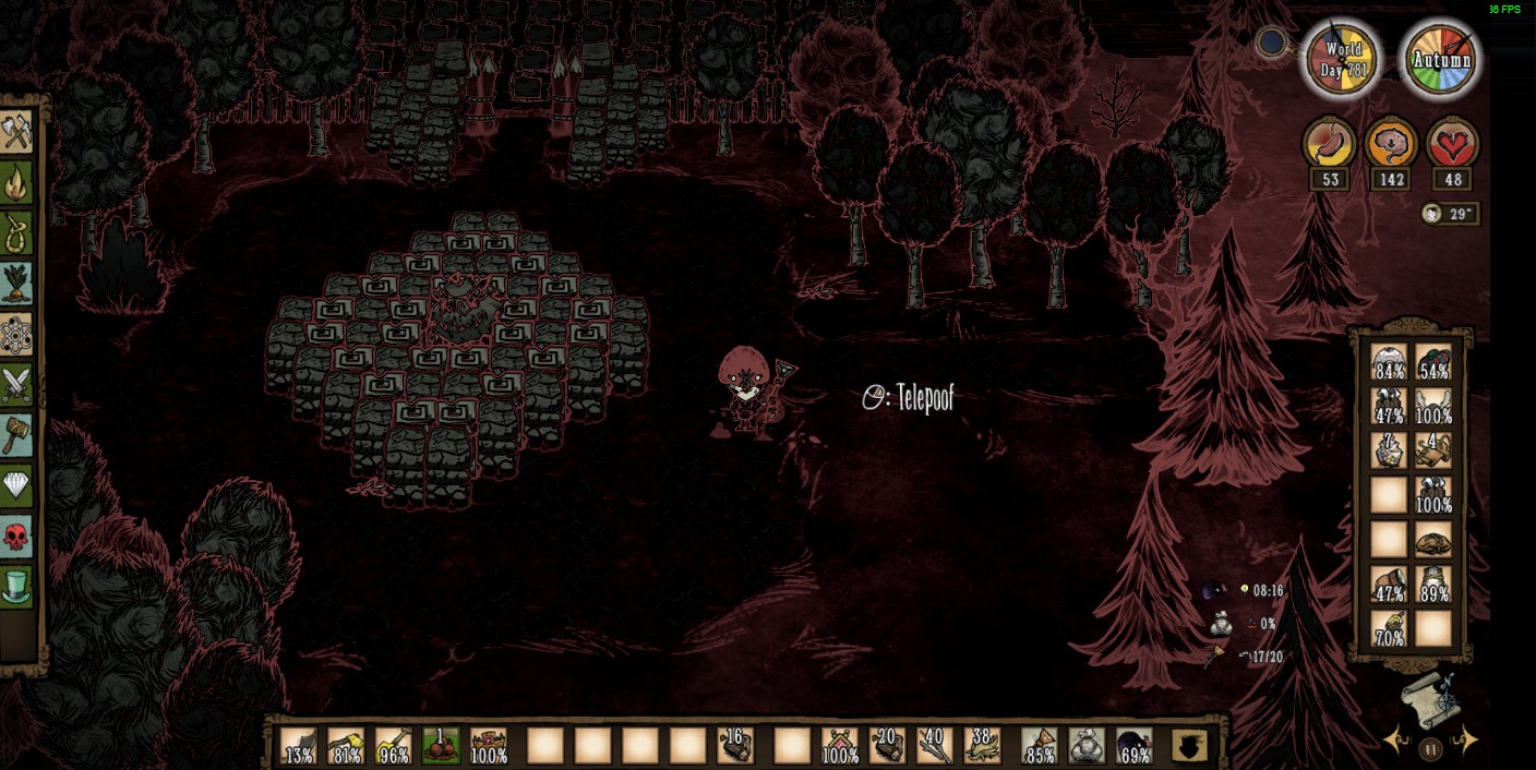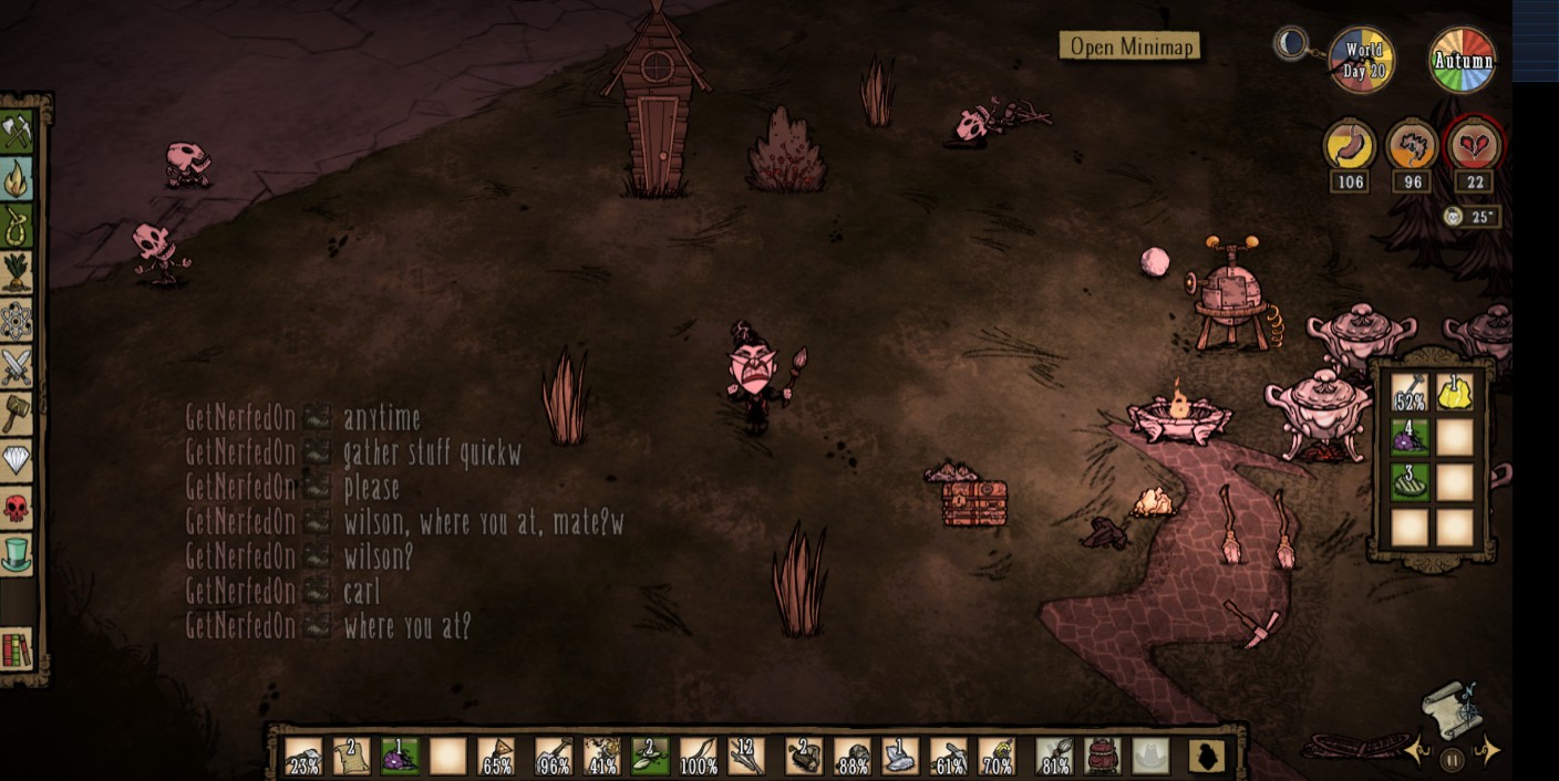 a Wilson joins but he strikes out for himself The last Wendy finally falls - dropping a load of unused, donated Ruins items - and quits and by day 20 i've managed to pull a decent base which can live off monster meat, but in a rather horrible mood.20181011213906_1.thumb.jpg.e0efdbc797ce766688945acaf3b4dcf2.jpg