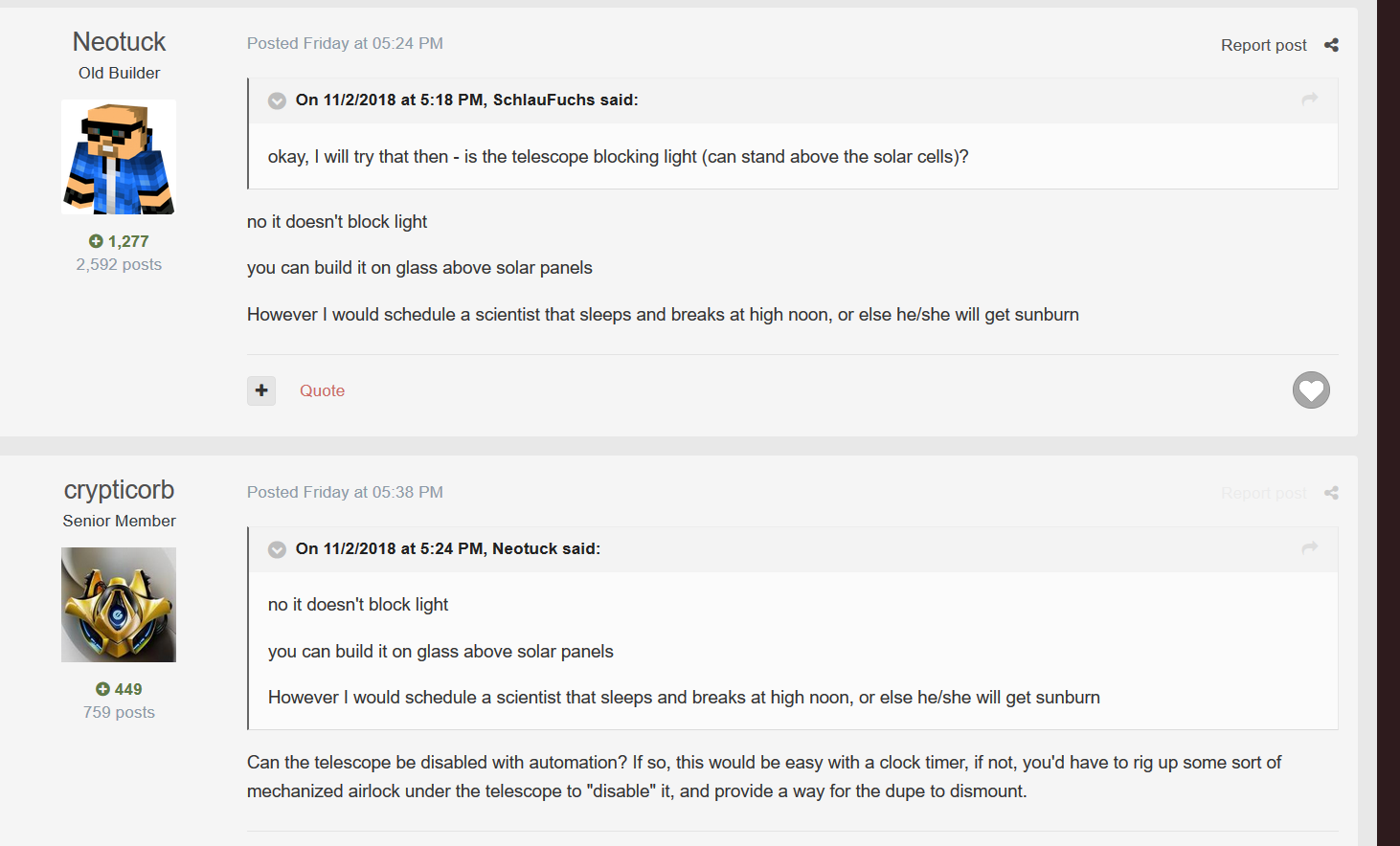 okay, I will try that then - is the telescope blocking light (can stand above the solar cells)?