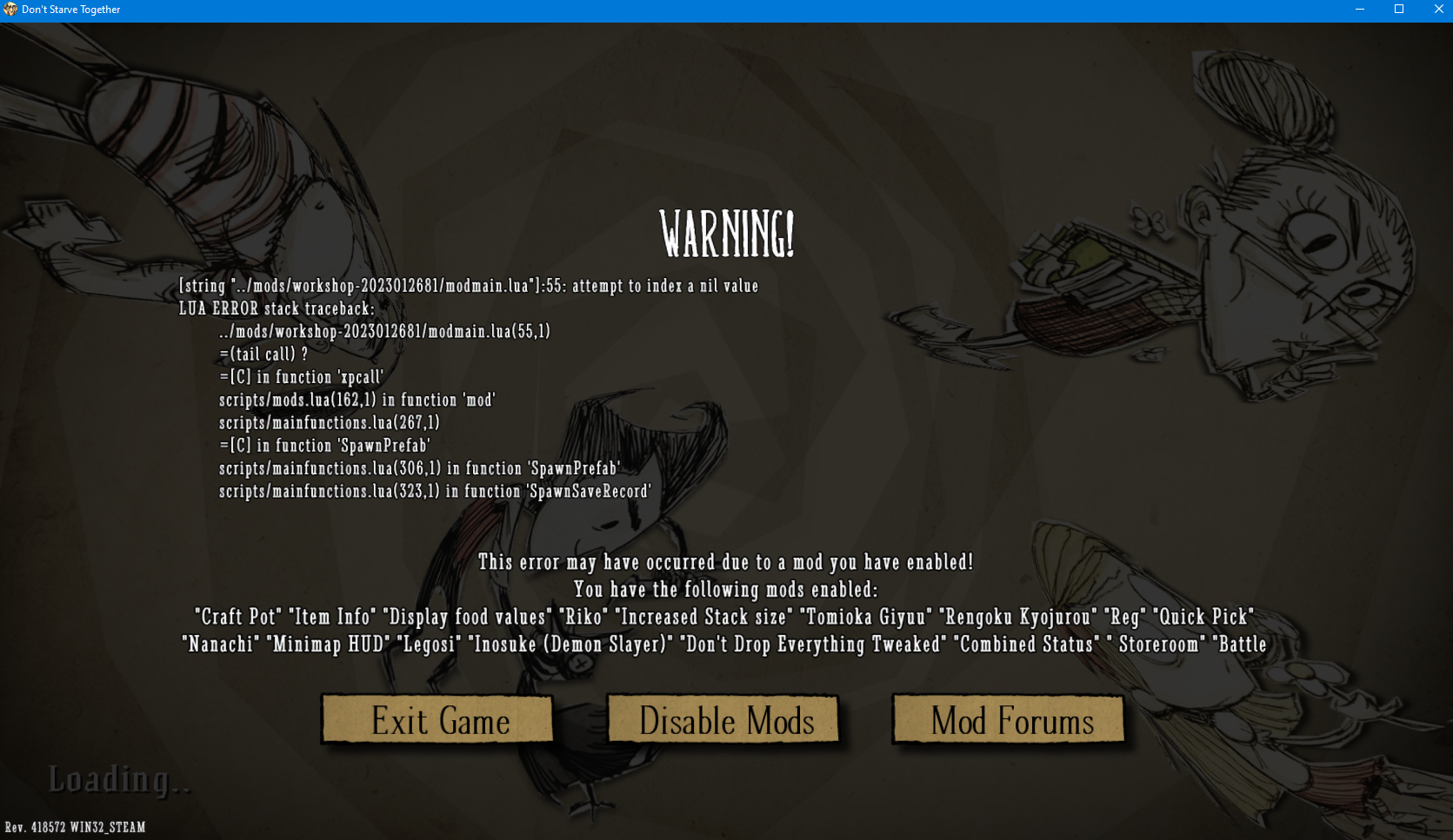 I bought 'Don't Starve Together' from Steam there by June. I played it well without any bugs pop up, until this few day I got this bugs which the photo shown. I already cancel some Mods, even though I'm using the same Mods with my friend, who did't face this error before, I still got this warning. The funny thing is if I play this game in the next day (which mean I'm going back to the world I played yesterday), I cannot go back to my world again, it just keep showing me this warning; but if I try to go back to world in the same day, it's work! If this problem keep intertwined me then I only can play this game on the same day, or else I cannot live in this world until winter time, YES I DIDN'T SURVIVE UNTIL WINTER BEFORE BECAUSE OF THIS ERROR :(