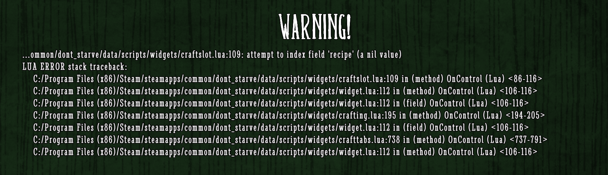 This error showed when I trying to go next to the Ancient Pseudoscience and craft something, I don't know what causes this bug.