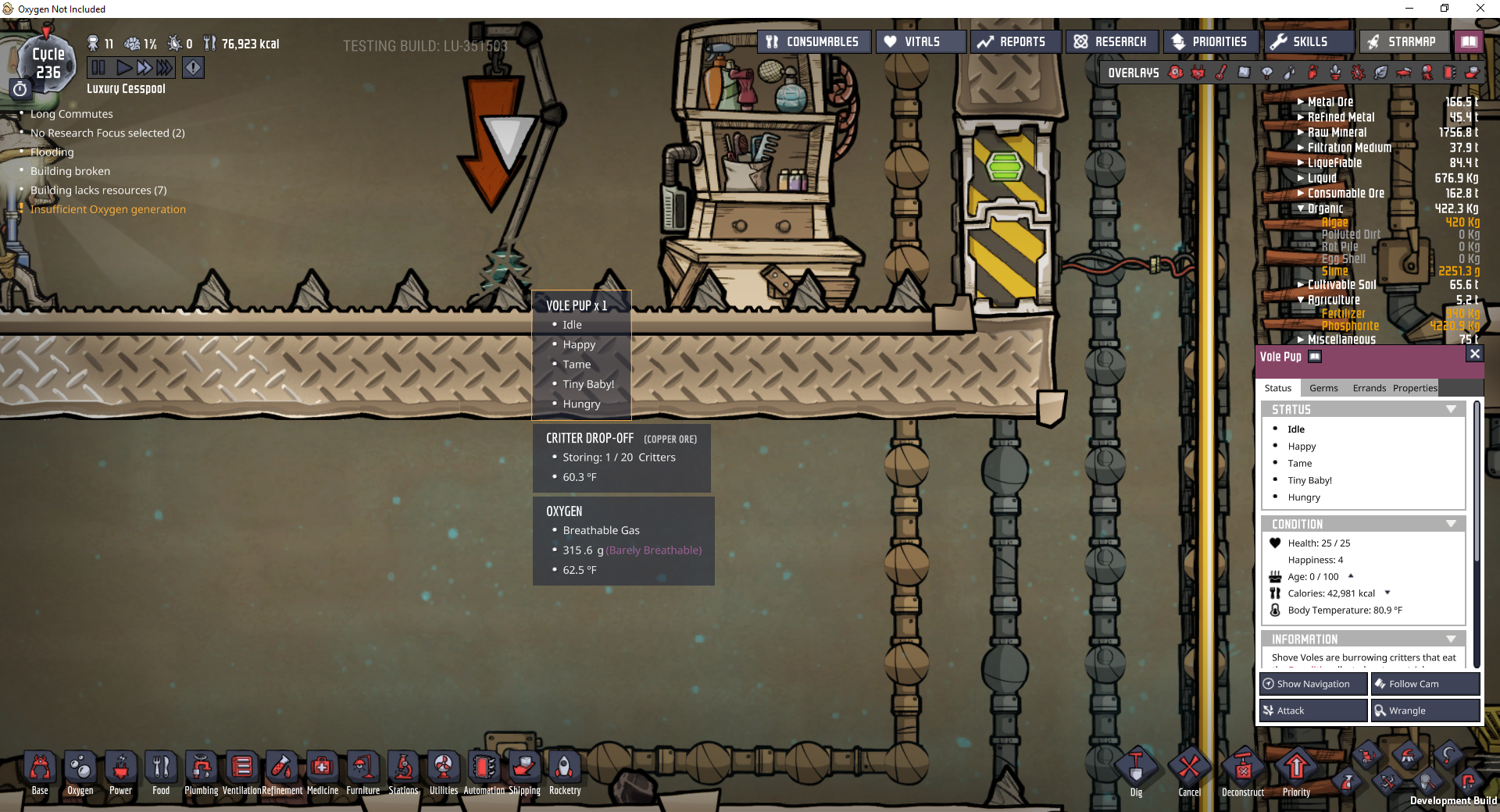 When wrangling a shove vole, it can bury itself. The dupe then delivers a "buried object" graphic instead of a shove vole graphic. This may or may not be specific to the vole pup. It is purely a graphical issue; it is a vole pup, just with the wrong graphic.