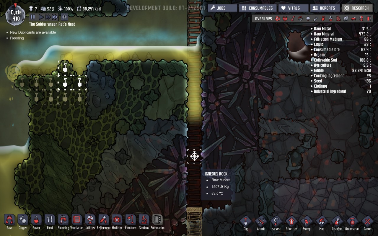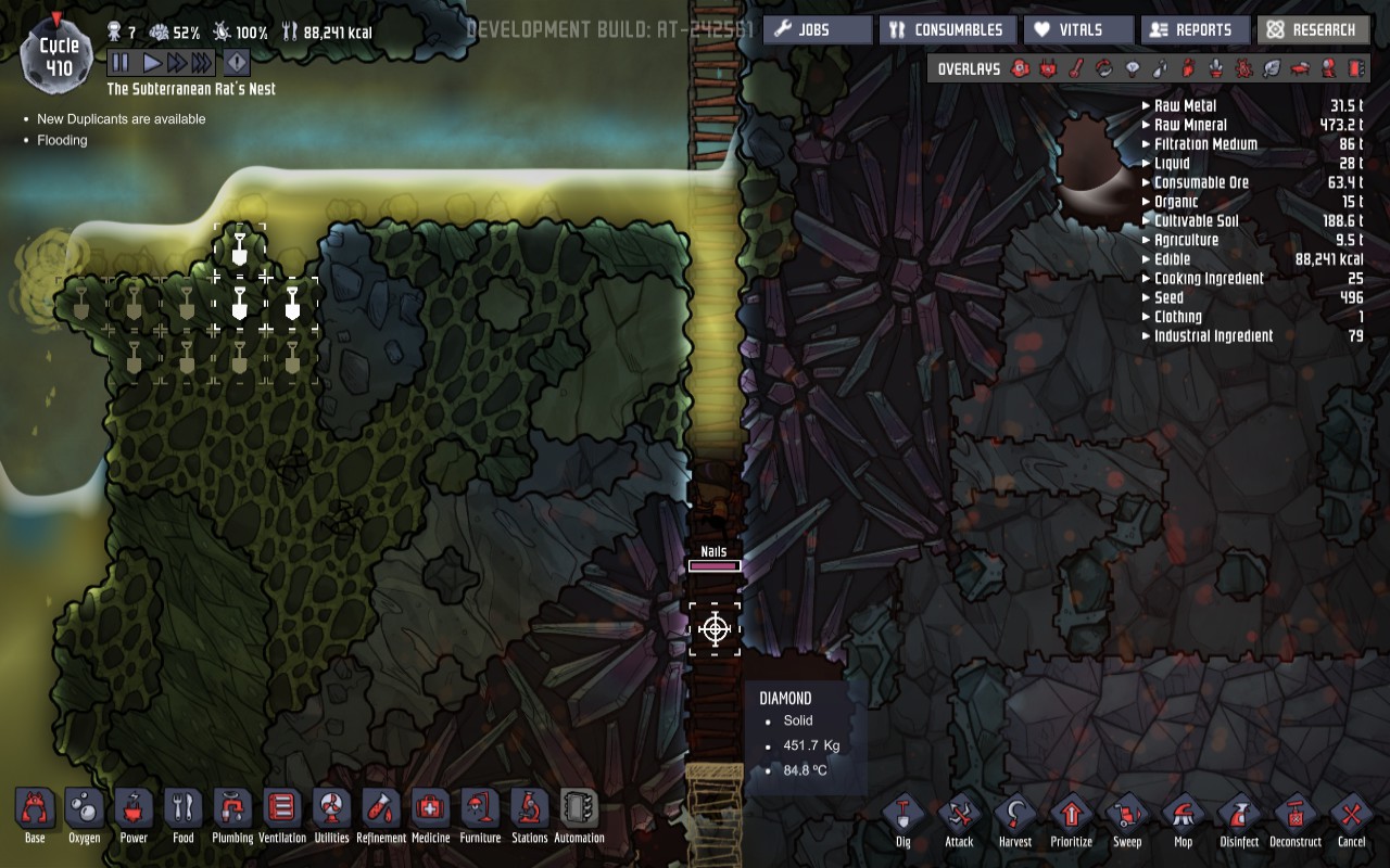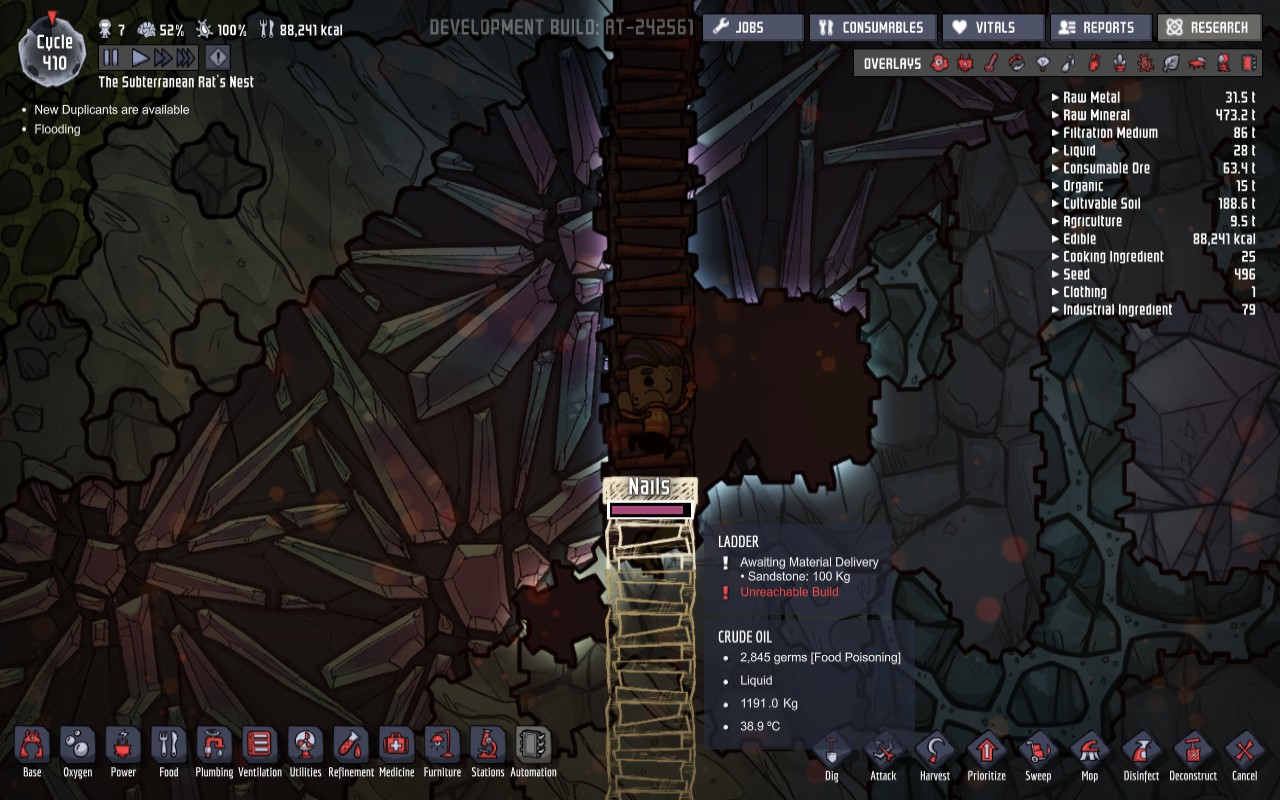 Tiles which duplicant must cross several (it seems to be if the path through liquid is 10+) liquid filled tiles to reach (encountered both vertical and horizontal) are classified as unreachable until manually told to travel to the nearest reachable tile and set speed to game speed to 1x. Once they get close, the formerly unreachable tile becomes reachable for traveling, but jobs do not necessarily become reachable.