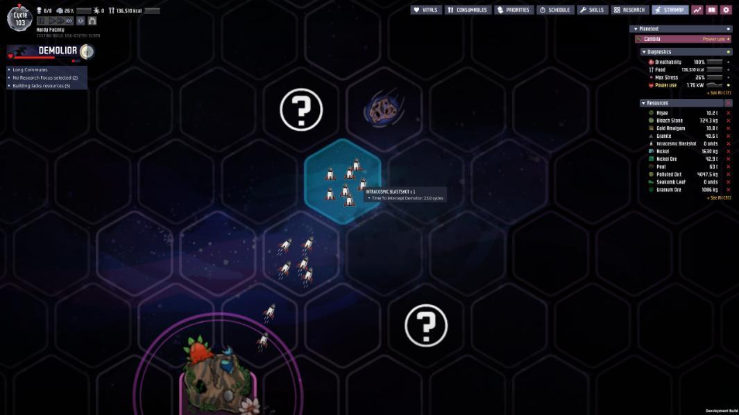 Launched 25 intracosmic blastshots from one blaster as quickly as it would reload. Most hit the asteroid, but ~7 or so ended up with an arrival time shifting to ~20 cycles till impact